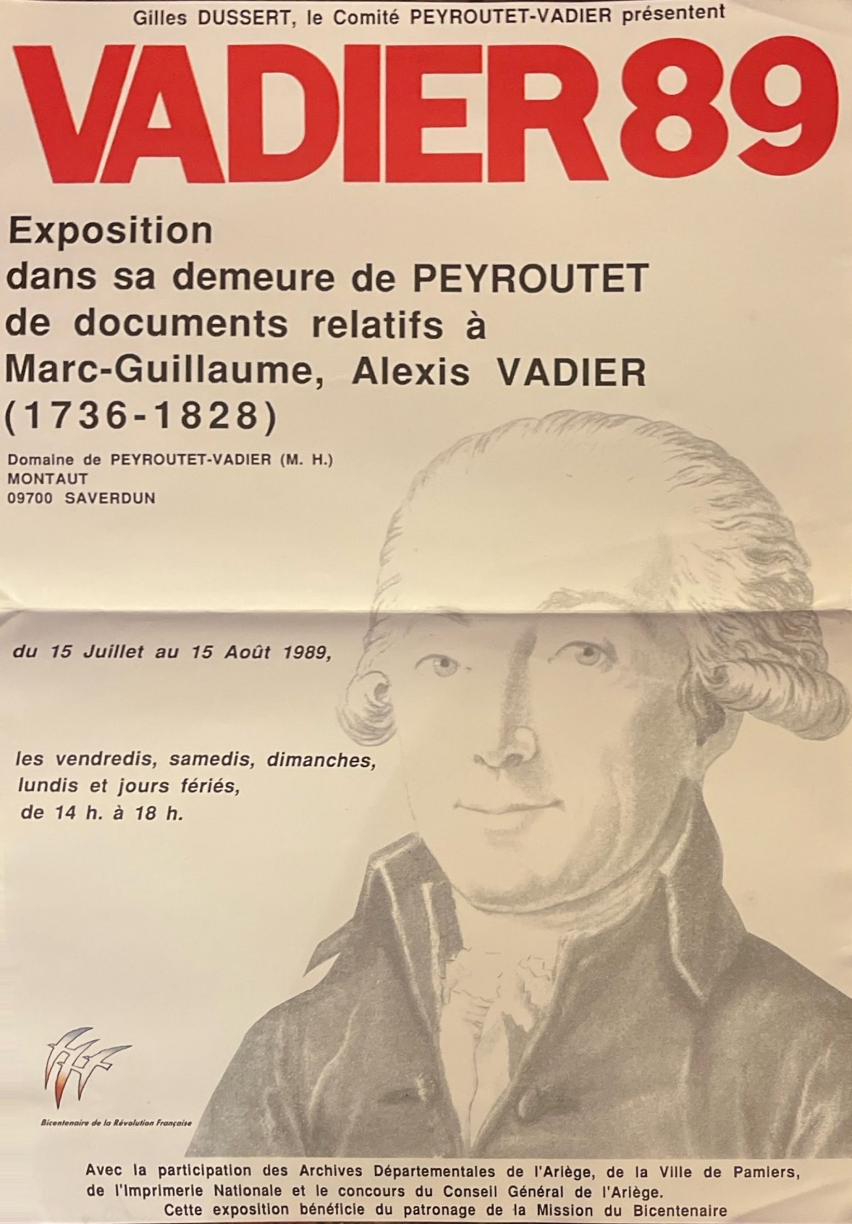 L’exposition « Vadier 89 » est organisée à Peÿroutet, avec la participation des Archives départementales de l’Ariège, de la Ville de Pamiers et de l’Imprimerie nationale, le concours du Conseil général de l’Ariège, et le patronnage de la Mission du Bicentenaire de la Révolution française.